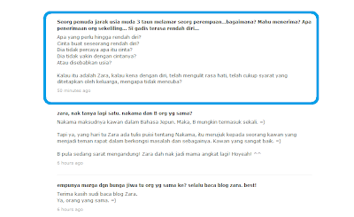 hehe..da mcm kaunselor cinta plak cgu zara :) so,pe pndpt kalo cnta jrk jaoh? da lebih staon b'sme bru 2x jmpe..org kate pelik,tp kalo bhgia,abaikn jela kate2 org,kan :)))